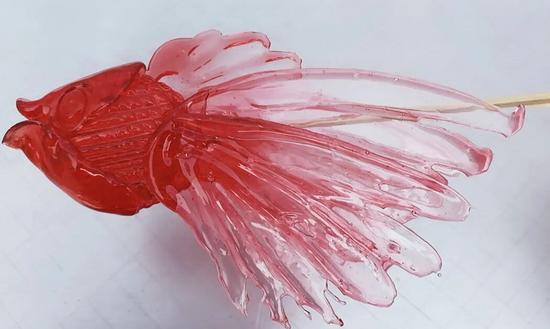 为了使糖画色彩丰富,他通过融入不同颜色的天然食材来改变糖的底色,使作出的糖画更加生动。