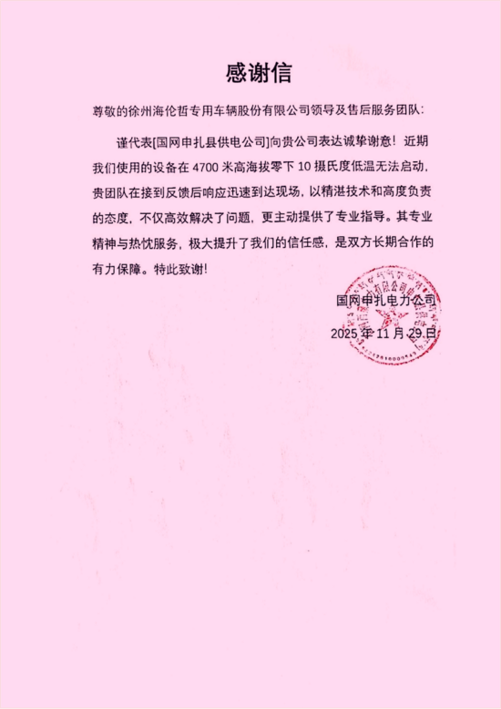 近日,我们收到了一封来自国网西藏电力有限公司申扎县供电公司的特别感谢信。信中的文字简短,情谊却深重——它背后,是一段发生在海拔4700米、零下10摄氏度环境下的温暖服务故事。