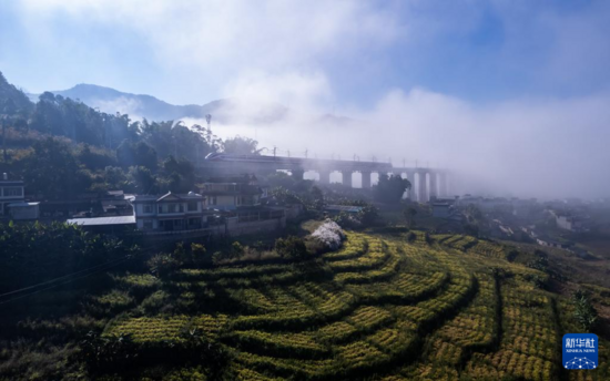 ▲ 12月2日,一列中老铁路“复兴号”动车组穿过云南省普洱市宁洱哈尼族彝族自治县的麦田(无人机照片)。