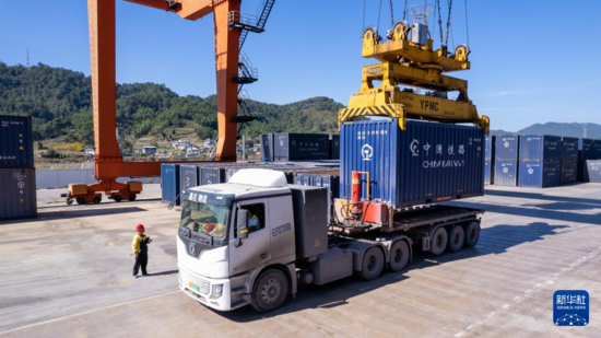 ▲ 12月2日,中老铁路宁洱站货场的工人在指挥龙门吊装卸铁路集装箱(无人机照片)。