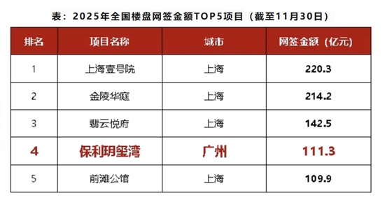 中指院数据显示,截至11月30日,全国仅5个项目年度成交额突破百亿元。保利玥玺湾以“单日破百亿”的成绩,不仅刷新广州纪录,更直接闯入全国年度销售额第四。