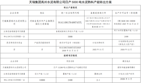 天瑞集团郑州水泥有限公司日产11200吨水泥熟料生产线建设项目设计产能10000t/d,置换产能2400t/d,置换比例为2:1,计划2026年3月点火投产。
