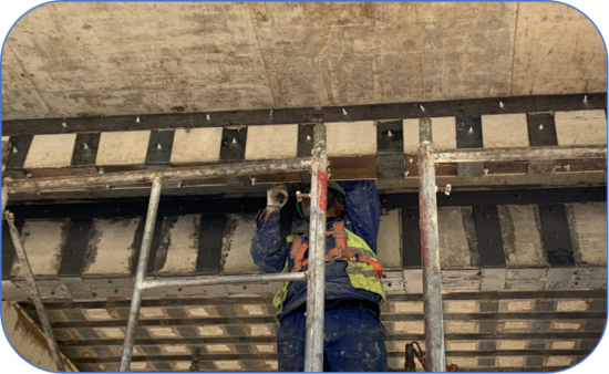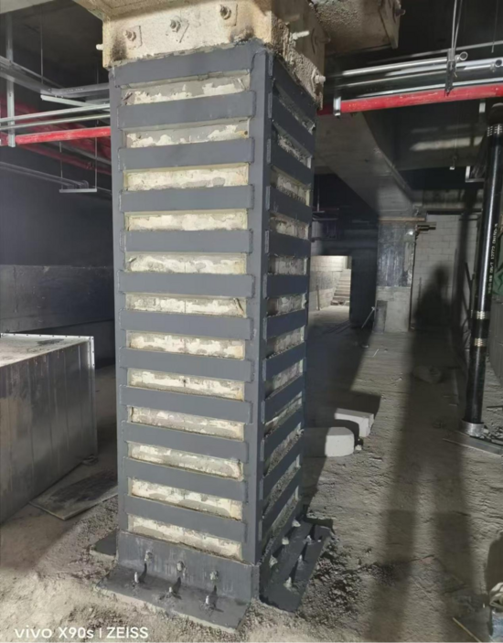 综合应用工业遗产修缮加固施工技术,具体包含粘贴碳纤维加固施工工艺、粘贴钢板加固施工工艺、基础圈梁托换技术、水刷石外饰面原貌修复施工工艺、木纹清水混凝土施工工艺、清水砖施工工艺等。