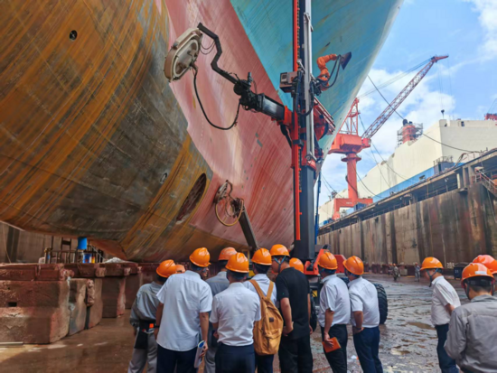 目前,鼎力船舶除锈、喷涂机器人已从走向真实船坞,已在万邦重工、长宏国际及众多海外船企实现大面积应用,从高空作业平台到船舶修造机器人,鼎力的跨界不仅是产品的延伸,更是对绿色产业变革的回应!
