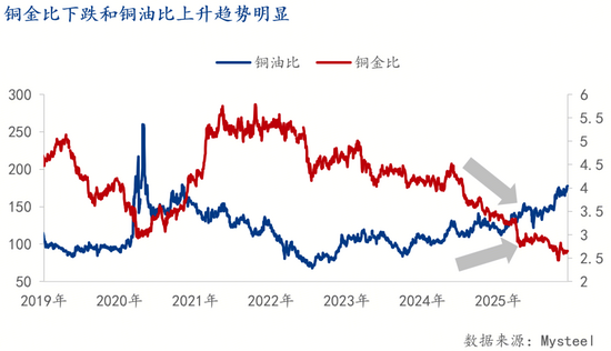 商品板块间的分化主要体现在黄金价格的不断新高,有色行情的走强但原油价格中枢的逐步下移及黑色系价格却不断磨底。计算铜金比和铜油比,发现2023年开始,有色的韧性确实持续较强,即便2023年在后疫情时代,全球经济增速明显放缓,油价延续下跌趋势,但是有色价格却相对偏强。但从2023年开始的对全球通胀以及衰退的担忧也促使铜金比不断下移。