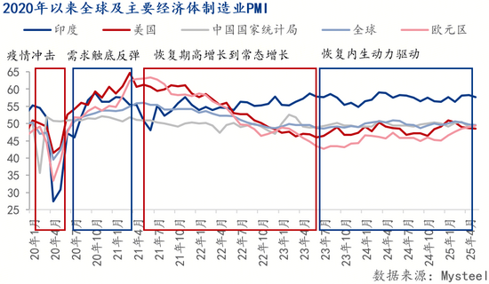 后疫情时代,投资者信心普遍不足,风险偏好持续较弱的情况仍在,2023年硅谷银行等多家银行接连倒闭,引发银行危机。彼时,不论是能源还是有色、黑色等工业金属价格均缺乏上涨动力,大宗商品价格呈现趋势性下跌,而由于新能源的发展驱动,有色金属的价格呈现出较强韧性,跌幅最小。2023年10月,巴以冲突爆发成为贵金属价格开启牛市的起点事件。直到2024年全球重新开启降息周期,欧元区央行率先开启降息,全球进入弱复苏态势。从各主要国家制造业PMI数据来看,印度等新兴国家发展势头相对更强。