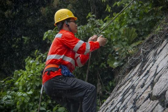 32岁的工长虞东霖用手抹了把顺着安全帽檐滑落的雨水,整个人贴着近乎垂直的堑坡。安全绳在他腰间拉得笔直,与岩壁摩擦出细碎的“簌簌”声。