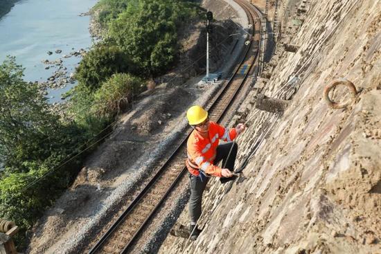 初到工区时,面对陡峭的堑坡,虞东霖连空手爬坡都喘得厉害。工区附近有一处被大家称为“练兵崖”的40米高陡坡,是他最初的训练场。老工长带着他一次次负重攀爬。“脚趾抠地!手指抠石!”师傅的教诲声,至今还在他耳边回响。“脚底打滑时,安全绳会勒进腰间,勒得生疼。”虞东霖回忆道。