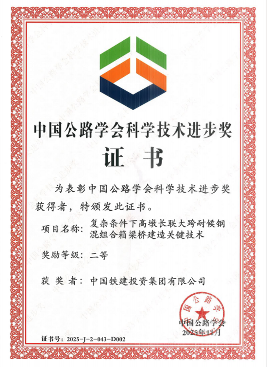 12月2日,中国公路学会2025学术年会在厦门开幕。开幕式上举行了2025年度中国公路学会科学技术奖颁发仪式,由中国铁建投资集团有限公司投资建设的临猗黄河大桥及引线工程荣获二等奖,成果名称为“复杂条件下高墩长联大跨耐候钢混组合箱梁桥建造关键技术”。