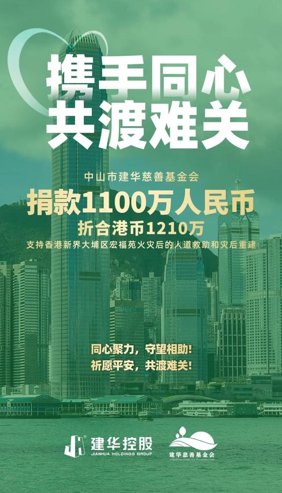 香港新界大埔区宏福苑发生严重火灾,造成重大人员伤亡,牵动全国人民的心。由建华控股集团发起的中山市建华慈善基金会第一时间启动响应机制,主动联系中山市红十字会询问捐赠渠道及方式,并于2025年12月1日通过中山市红十字会捐款人民币1100万元(折合1210万港币)用于支持香港新界大埔区宏福苑火灾后的人道救助和灾后重建。