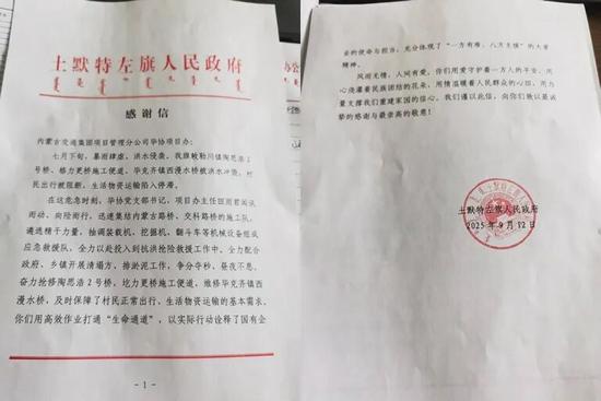 田雨君所在的毕协项目办于2025年9月获得土默特左旗人民政府的感谢信一封