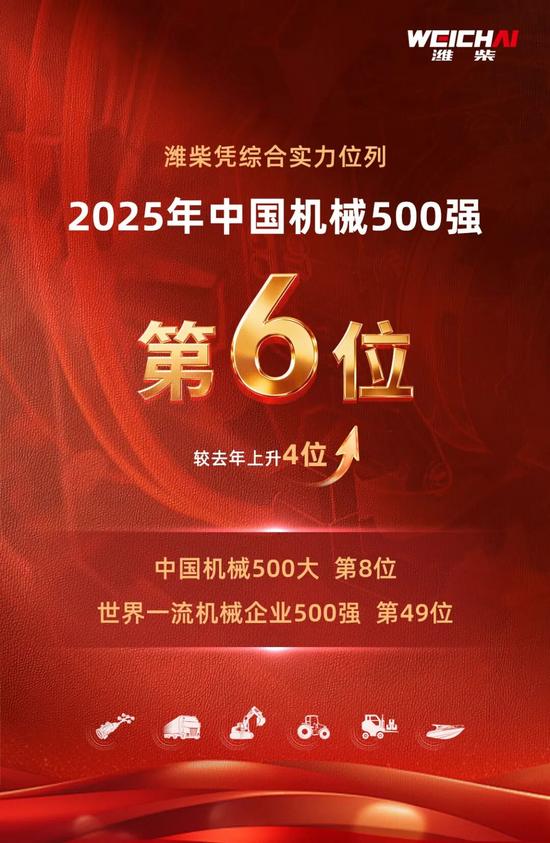 12月4日,由中国机械工业企业管理协会主办的2025年中国机械500强研究报告发布会暨中机企协业务总部启用仪式在江苏举办,潍柴凭综合实力位列“2025年中国机械500强”第6位,较去年上升4位;同时位列“2025中国机械500大”第8位、“2025世界一流机械企业”第49位,以多维优异表现彰显装备制造领军企业硬核实力。