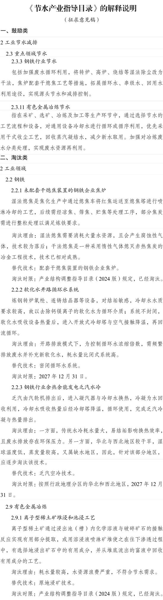 《节水产业指导目录》的解释说明中,涉及钢铁与有色金属行业的内容摘录如下: