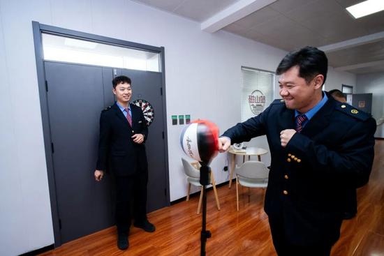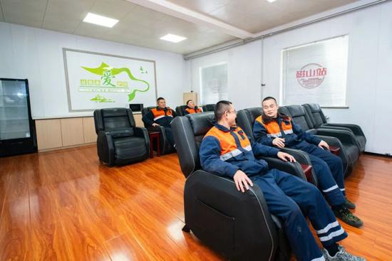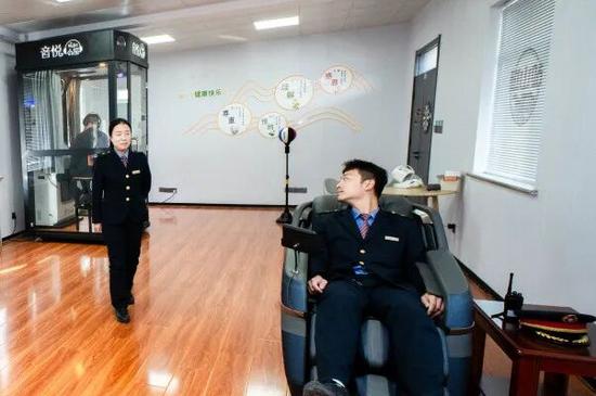 职工放松室内,按摩椅、K歌房、拳击反应球等设施种类丰富,满足职工们多样化的休闲需求。此外,放松室内还备有血压仪、小药箱等,让职工能够随时关注自己的健康状况。