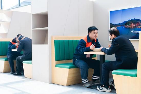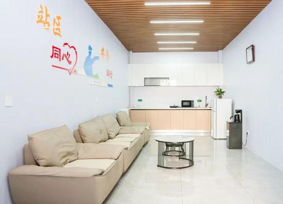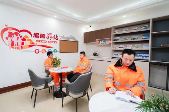温馨的职工驿站配备休闲桌椅、饮水机。不少职工在闲暇时,喜欢来这里读书、聊天,享受片刻的宁静与惬意。