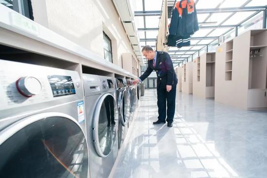 洗衣房内,7台全自动洗衣机整齐排列,各单位衣柜标识清晰明了。职工们只需通过App轻轻一点,即可预约送洗、领取衣物,全程由专人服务,省心又省力。