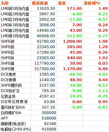 12日,LME六种基本金属价格涨跌互现。三月期铜价收于11620.5美元吨,上涨1.49%。三月期铝价收于2897.5美元吨,下跌0.22%。三月期铅价收于2002.5美元吨,下跌0.57%。三月期锌价收于3098美元吨,上涨0.24%。三月期锡价收于40068美元吨,下跌0.77%。三月期镍价收于14940美元吨,上涨0.29%