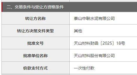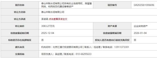日前,根据相关平台显示,泰山中联水泥有限公司持有的土地使用权、房屋建筑物、构筑物及机器设备等资产转让,转让底价为3083.27万元