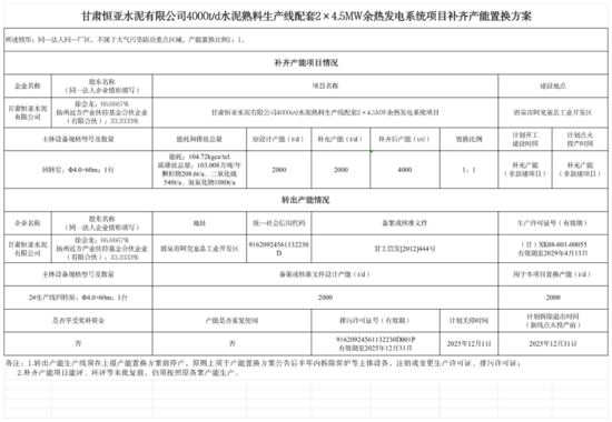 根据公示,甘肃恒亚水泥有限公司4000t/d水泥熟料生产线配套2×4.5MW余热发电系统项目原设计产能2000t/d,补充产能2000t/d,补齐后产能4000t/d,置换比例为1:1。该公司一条2000t/d水泥熟料线用于本项目置换产能,计划2025年12月31日前拆除退出。