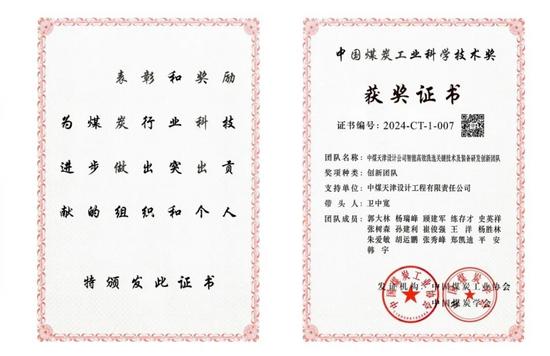 2024年11月,中煤天津设计公司智能高效洗选关键技术及装备研发创新团队被授予“中国煤炭工业协会科学技术奖创新团队”称号,这是工程设计行业的首个创新团队奖项,也是对这支奋斗了16载的队伍最好的褒奖。