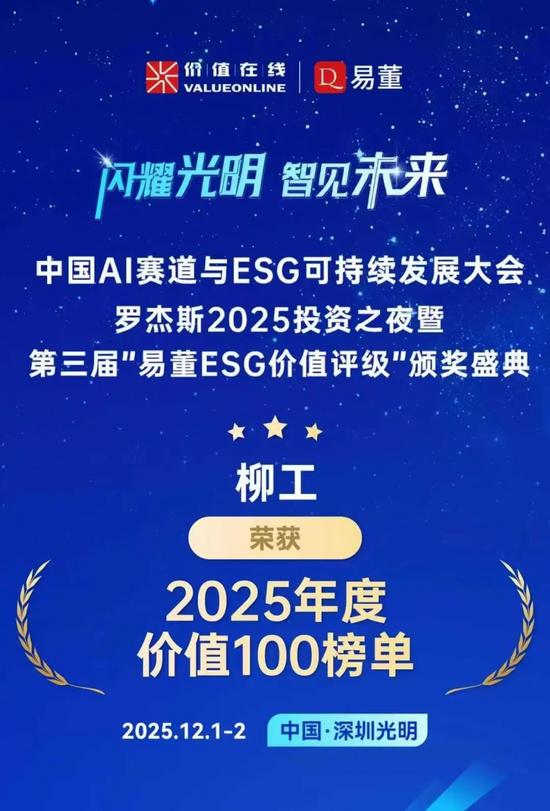 近日,以“闪耀光明 智见未来”为主题的“中国AI赛道与ESG可持续发展大会”在深圳市光明区举行。当晚,“罗杰斯2025投资之夜暨第三届‘易董ESG价值评级’颁奖仪式”同步启幕,柳工凭借在可持续发展领域的卓越实践与亮眼成果,荣登“易董2025年度价值100榜单”。
