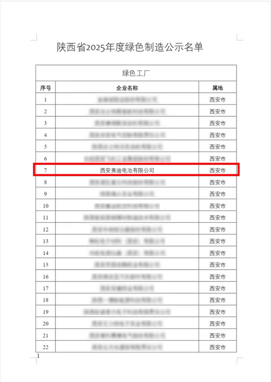 近日,陕西省工业和信息化厅正式公布“2025年度省级绿色制造名单”,西安弗迪电池有限公司凭借在节能减排、绿色制造、环境保护等方面的突出表现,荣获2025年陕西省绿色工厂。