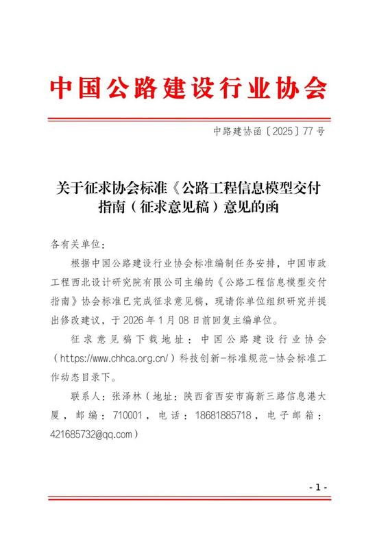 中路建协函〔2025〕77号-关于征求协会标准《公路工程信息模型交付指南》(征求意见稿)意见的函.pdf