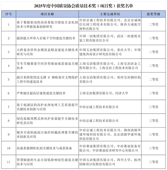 近日,中国质量协会正式公布《2025年度中国质量协会质量技术奖获奖名单》,中国中冶共计5家子企业的11项质量技术创新与实践成果获奖,其中二等奖6项、三等奖5项,获奖总数同比增加1项,二等奖数量同比增加5项,获奖数量和质量实现双提升,以实际行动助推公司质量技术发展。