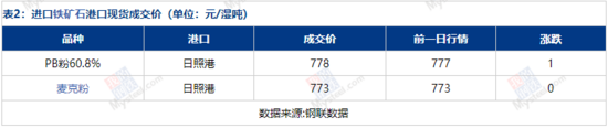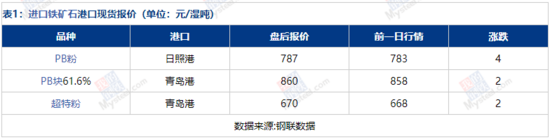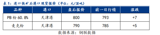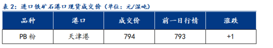 表1:进口铁矿石港口现货报价(单位:元/湿吨)