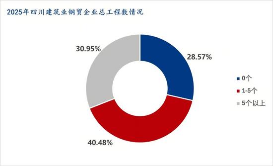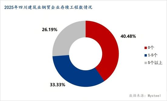 根据调研,2025年四川建筑钢材钢贸企业存续工程项目数下降,40.48%的受访钢贸企业表示工程项目已经全部结束,33.33%的钢贸企业存续的工程项目总数目不足5个,26.19%的钢贸企业还还有一定的存续工程项目支撑。