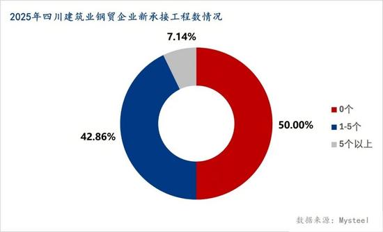 根据调研,2025年四川建筑钢材钢贸企业新接工程项目意愿普遍不强,50%的受访钢贸企业表示今年未承接任何的工程项目,42.86%的钢贸企业新承接的工程项目总数目不足5个,只有7.14%的钢贸企业还在积极承接一些新的工程项目。