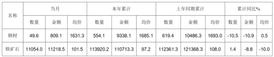 2025年月,我国进口铁矿石054.0万吨,环比减少76.9万吨、降幅0.7%;均价11.5美元/吨,环比上涨0.9美元/吨、涨幅0.9%。1-1月,累计进口铁矿石113920.2万吨,同比增加1559.0万吨、增幅1.4%。