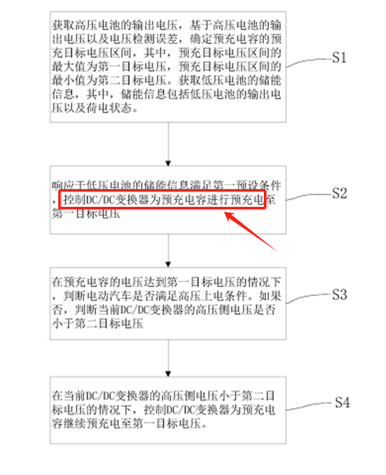 即:第一步确定预充电容的预充目标电压区间,该电压区间的最大值为第一目标电压,该电压区间的最小值为第二目标电压;响应于低压电池的储能信息满足第一预设条件,控制DC/DC变换器为预充电容进行预充电至第一目标电压;