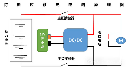 那么DCDC预充电的逻辑就是取消上面这个仿佛成本高、占体积、易坏的组件( 需要增加额外的预充继电器与预充电阻,增加成本,同时需要额外的空间对其进行布置,增加了电池包内高压配电盒的尺寸与重量,不利于 电动汽车的轻量化);DCDC预充电的逻辑来自于特斯拉TESLA: