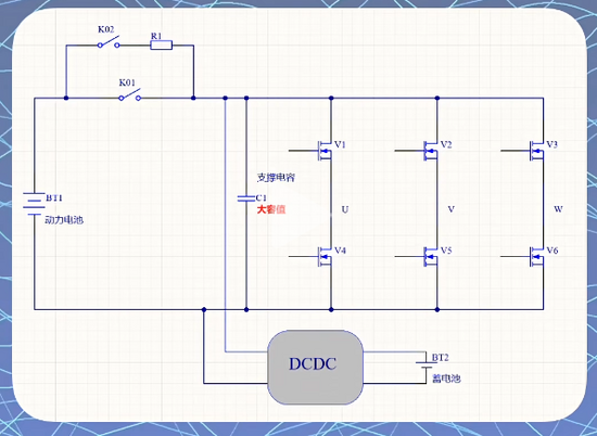 大家都知道,电动汽车起动方式不同于传统燃油车,通过控制高压电池输出端的主继电器吸合,即可完成电动汽车的高压上电与起动。电池电压高,上电瞬间对电容充电的电流非常的夸张,为了预防这种大电流下的冲击,需要做预充回路: