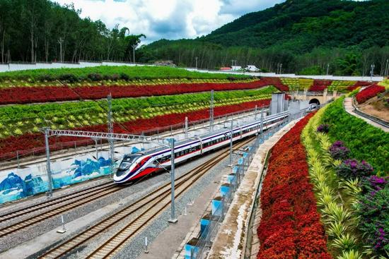 红得热烈的夹竹桃、黄得耀眼的九里香、紫得沉稳的万年麻……把边坡层层晕染,像不小心打翻了调色盘,让钢铁巨龙一路沿着彩虹飞驰。