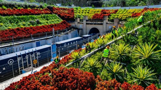 隧道里渗出的“矿泉水”和雨水,被收进升级后的灌溉系统,精准滴灌,一滴不浪费。4年下来,87种植物、226万平方米绿毯徐徐铺展开,不禁让旅客感叹:车在钢轨上跑,人在花丛中游。