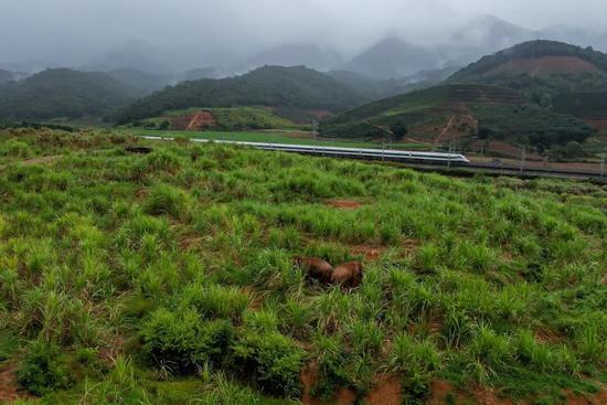 亚洲象甩着长鼻子慢悠悠踱步,身后百余米,便有复兴号飞驰而过。