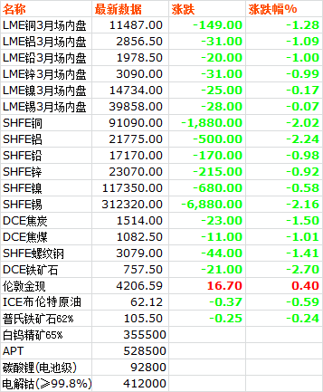 12日,LME六种基本金属价格全线下跌。三月期铜价收于11487美元吨,下跌1.28%。三月期铝价收于2856.5美元吨,下跌1.09%。三月期铅价收于1978.5美元吨,下跌1.00%。三月期锌价收于3090美元吨,下跌0.99%。三月期锡价收于39858美元吨,下跌0.07%。三月期镍价收于14734美元吨,下跌0.71%