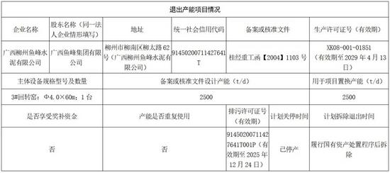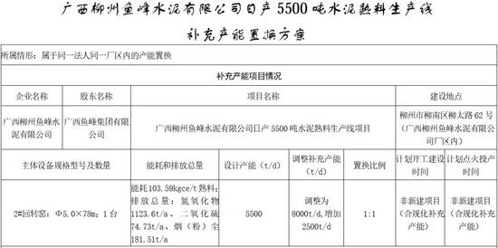 根据公示,广西柳州鱼峰水泥有限公司日产5500吨水泥熟料生产线项目产能调整为8000t/d,增加2500t/d,置换比例为1:1。广西柳州鱼峰水泥有限公司一条2500t/d水泥熟料线用于本项目置换产能,该生产线目前已停产,计划履行国有资产处置程序后拆除。