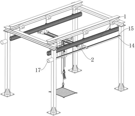 专利摘要显示,本发明提供一种高稳定性的不锈钢低磁起重机,包括总支架,所述总支架上滑动设置有两个主承载座,两个所述主承载座之间间隔固定有两根横柱以及两个支撑轨道,所述支撑轨道上滚动设置有两个支撑轮,两个所述支撑轮之间设置有支撑台,所述支撑轮通过连接杆固定在所述支撑台上,两根所述横柱贯穿所述支撑台并与其滑动连接,所述支撑台底部安装有吊装机构,两个所述主承载座之间活动设置有两根横向丝杆,两根所述横向丝杆一端伸出所述主承载座并安装有第一伞齿轮,所述主承载座一侧固定有限位座,所述限位座上活动设置有转轴,本发明解决了现有的不锈钢低磁起重机在运输工件过程中的稳定性较差的问题。