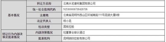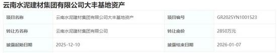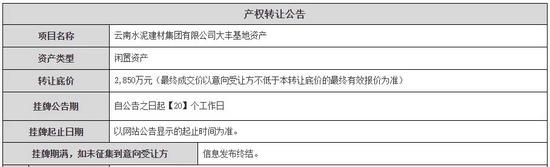 继前不久,云南水泥建材集团有限公司楚雄基地资产转让后,日前,根据相关平台显示,云南水泥建材集团有限公司又对其大丰基地资产进行转让,转让底价为2850万元
