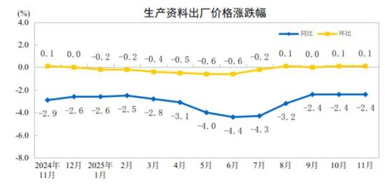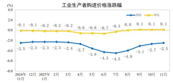 2025年11月份,全国工业生产者出厂价格同比下降2.2%,工业生产者购进价格同比下降2.5%;工业生产者出厂价格和购进价格环比均上涨0.1%,涨幅均与上月相同。1—11月平均,工业生产者出厂价格比上年同期下降2.7%,工业生产者购进价格下降3.1%。