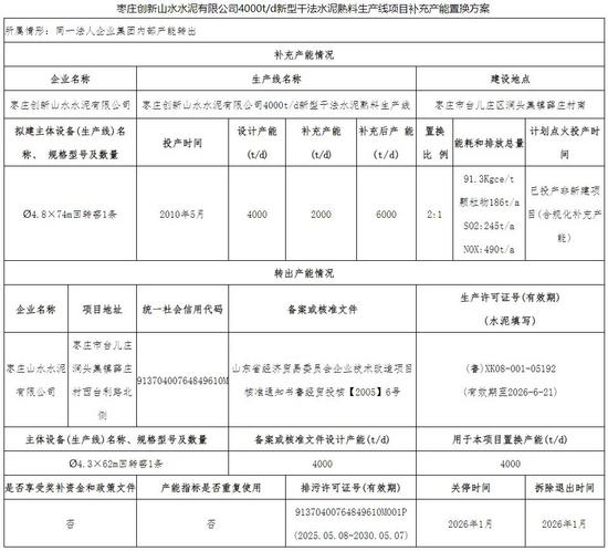 根据公告,枣庄创新山水水泥有限公司4000t/d新型干法水泥熟料生产线补充产能2000t/d,补充后产能6000t/d,置换比例为2:1。枣庄山水水泥有限公司4000t/d水泥熟料生产线用于本项目置换产能,计划2026年1月拆除退出。