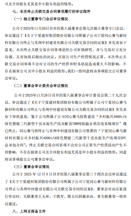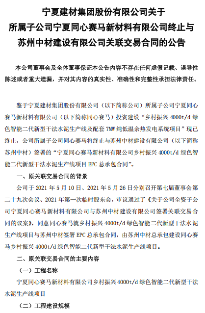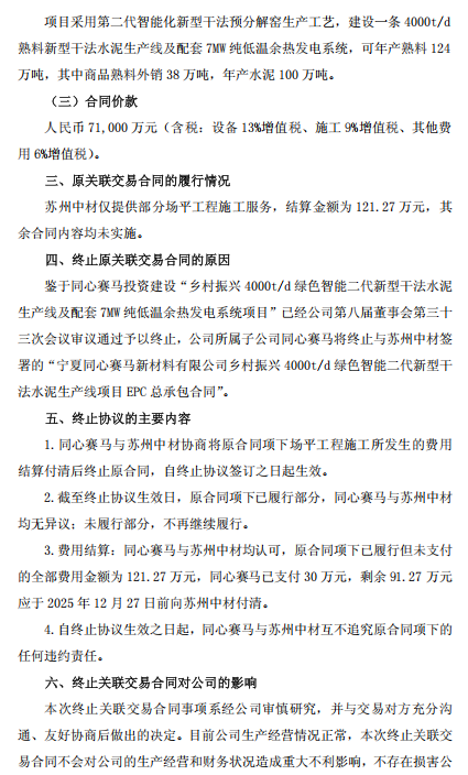 12月9日,宁夏建材集团股份有限公司发布《关于所属子公司宁夏同心赛马新材料有限公司终止与苏州中材建设有限公司关联交易合同的公告》显示,鉴于宁夏建材集团股份有限公司所属子公司宁夏同心赛马新材料有限公司投资建设“乡村振兴4000t/d绿色智能二代新型干法水泥生产线及配套 7MW 纯低温余热发电系统项目”现已终止,公司所属子公司同心赛马将终止与苏州中材建设有限公司签署的“宁夏同心赛马新材料有限公司乡村振兴4000t/d 绿色智能二代新型干法水泥生产线项目EPC总承包合同”。
