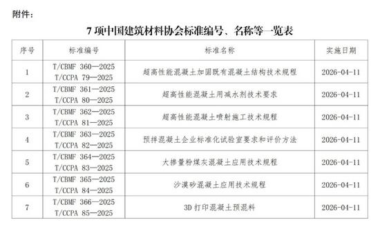 1211日,中国建筑材料联合会、中国混凝土与水泥制品协会共同批准发布《超高性能混凝土加固既有混凝土结构技术规程》《超高性能混凝土用减水剂技术要求》《超高性能混凝土喷射施工技术规程》《预拌混凝土企业标准化试验室要求和评价方法》《大掺量粉煤灰混凝土应用技术规程》《沙漠砂混凝土应用技术规程》和《3D打印混凝土预混料》项协会标准,自202611日起实施。