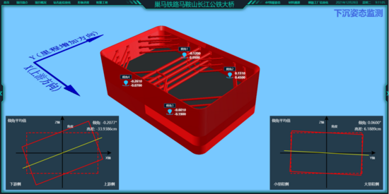 主塔4号墩60根直径4米、长度47米钢护筒,现场只需一台全站仪,配备激光扫描和专用软件,利用可视化屏幕随时调整垂直度,插打过程中控制偏差在3‰以内,远高于规范的1%要求。钢围堰浮运、定位和下沉过程中的姿态数据采集快速,传输及时,信息充分,全天候智能预警、纠偏调整,实现超大双壁钢围堰大节段底节平面分块水中浮态连接,保障对接口拼装精度。