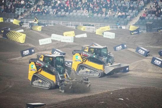 徐工设备时刻待命,每轮比赛后立即进入赛道修整,为选手打造安全稳定的比赛环境。滑移装载机装配松土耙与铲斗的工作组合,在修复赛道、恢复弹性地表方面表现十分出色。