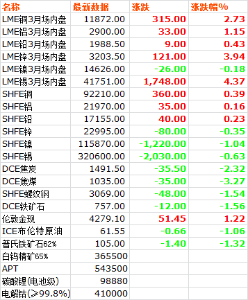 1211日,LME六种基本金属价格涨多跌少。三月期铜价收于11872美元吨,上涨2.73%。三月期铝价收于2900美元吨,上涨1.15%。三月期铅价收于1988.5美元吨,上涨0.43%。三月期锌价收于3203.5美元吨,上涨3.94%。三月期锡价收于41751美元吨,上涨4.37%。三月期镍价收于14626美元吨,下跌0.18%