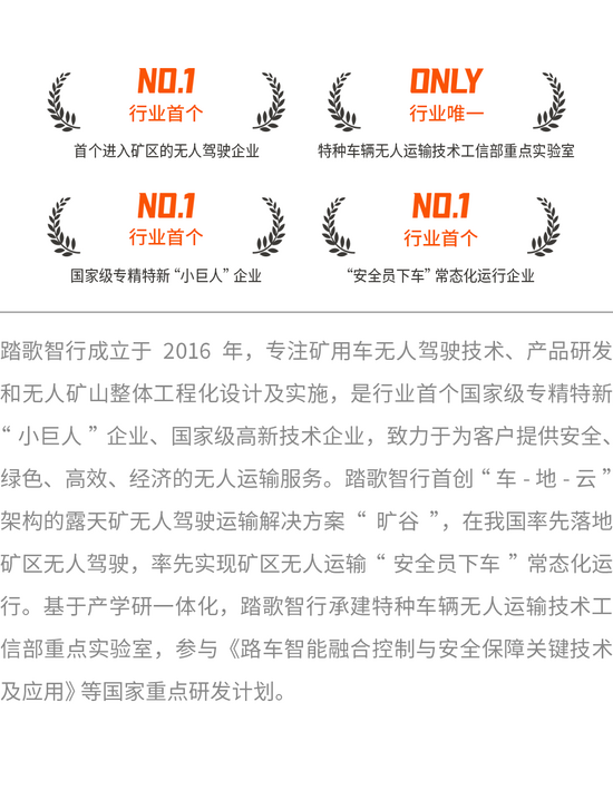 自2018年打造出中国第一台无人驾驶宽体车和中国第一台无人驾驶矿卡至今,踏歌智行已服务30余个大型智能化露天矿项目,支撑14座露天矿高质量通过智能化验收,为国内露天矿智能化升级提供了可靠的系统服务及技术保障。